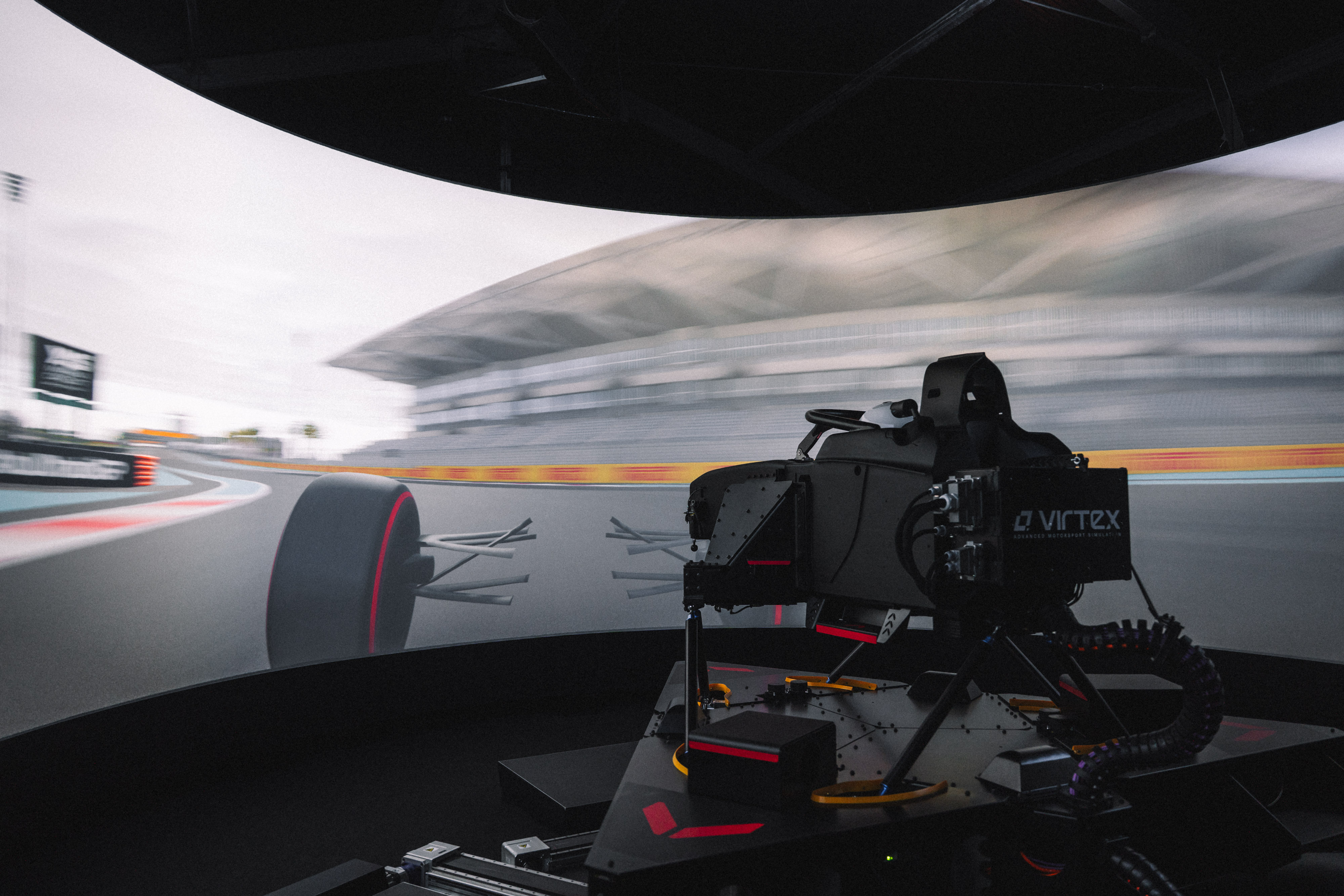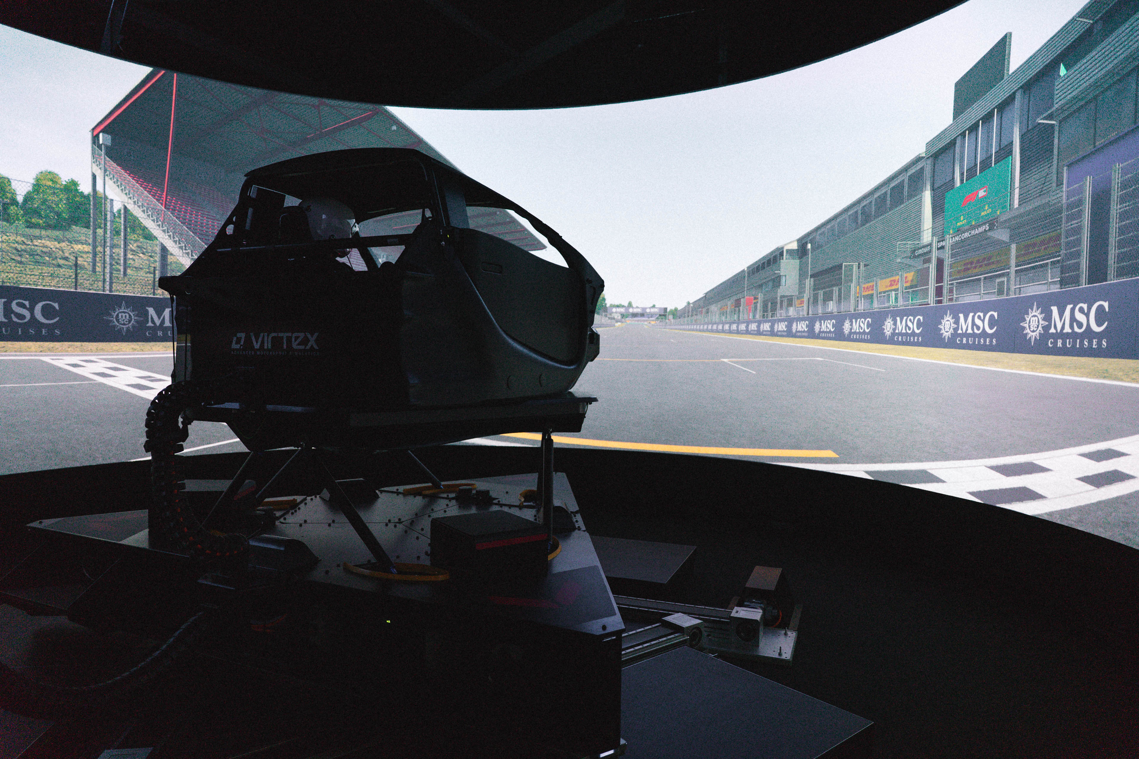 At Virtex, our single-seater simulator is built around a real F2 chassis, fitted with the original steering wheel, controls, brake and throttle pedals. This is not simply a question of aesthetics. Placing the driver in the actual monocoque, with the correct seating position and control geometry, eliminates the adaptation layer entirely. The muscle memory the driver develops in the simulator is the same muscle memory they will rely on at the circuit.